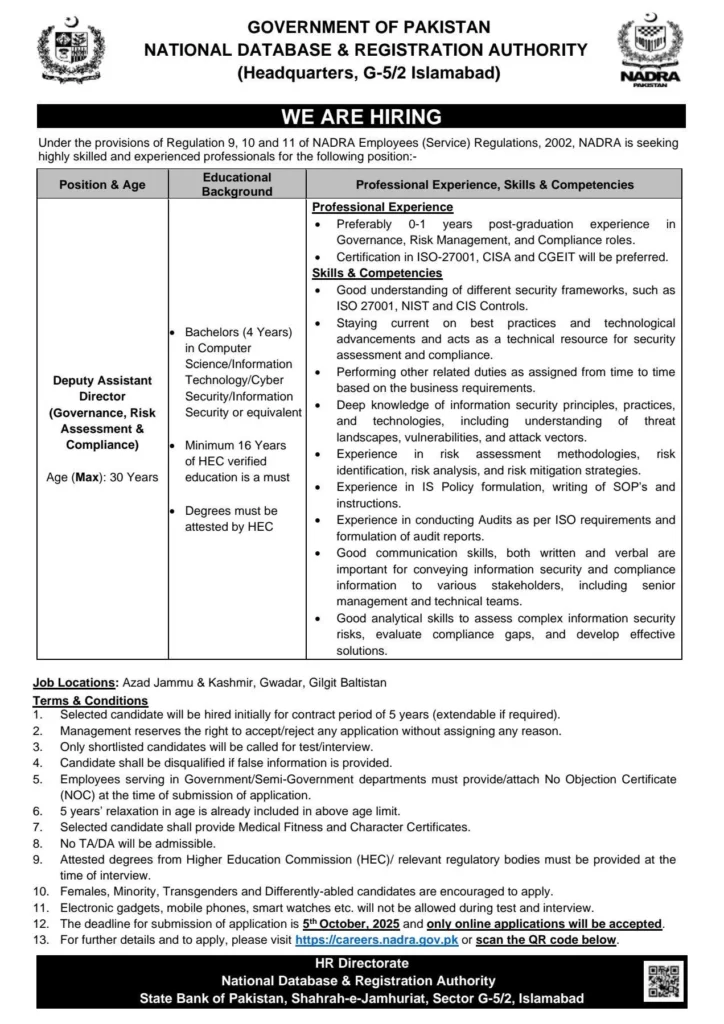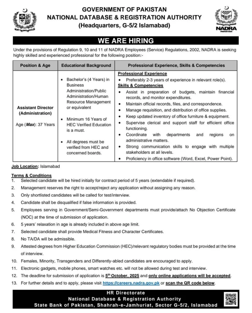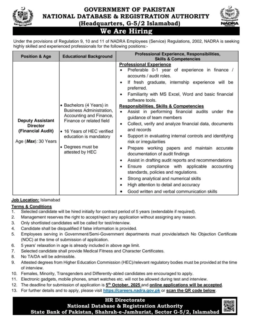 If you’re aiming for NADRA jobs 2025 and want a respected role in Pakistan’s public sector, start your application today. Review the official post-wise details, gather your documents, and apply online before 05 October 2025. A focused, well-prepared application can be your first step toward a rewarding career at NADRA.