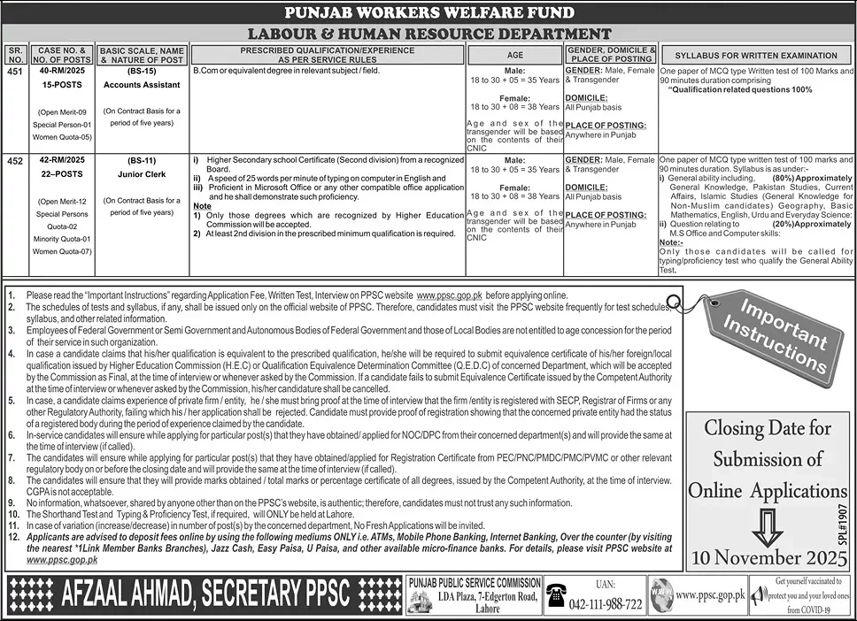 If you’re ready to make a difference while building a successful professional career, don’t wait, visit the PPSC website today and apply online before the deadline. These Punjab Workers Welfare Fund Jobs could be your gateway to long-term success, professional growth, and financial stability in 2025 and beyond.